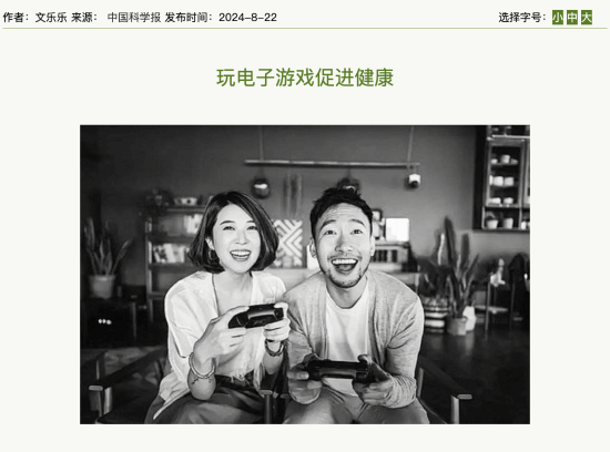 8月22日,中国科学报在第二版综合版面刊登了一篇名为《电子游戏对健康的影响》的文章。这篇文章指出,尽管电子游戏经常被质疑,但它似乎确实能够促进健康。