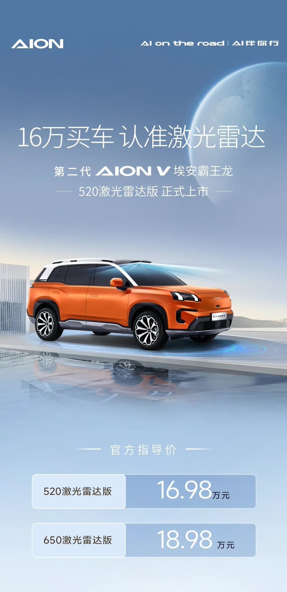 广汽埃安今日发布了第二代AION V纯电SUV的激光雷达版车型,售价16.98万元。这一版本被号称是“16万唯一搭载激光雷达智驾”的车型,具备5个毫米波雷达和11个视觉摄像头,并采用英伟达Orin-X算力平台,支持城区无图NDA、高速智驾领航以及全场景自动泊车等功能。