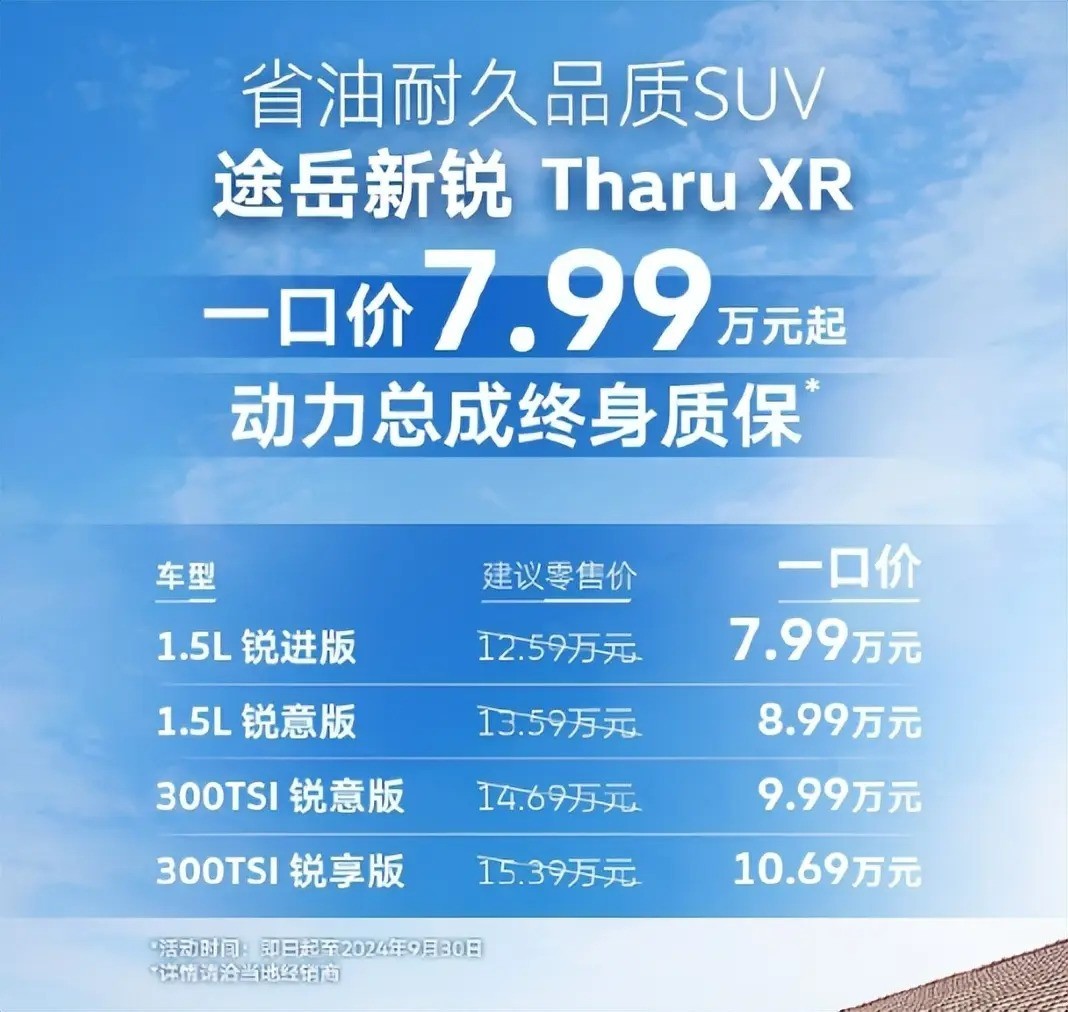 在2024年的成都车展上,上汽大众途岳新锐正式上市。这款新车共推出了4款车型,售价12.59-15.39万元。然而,官方推出了一项“限时一口价”政策,即在9月30日前购买首任非营运车车主,并按规定在大众经销商处进行保养及事故维修(限首任非营运车车主)时,可享受7.99-10.69万元的优惠价格。