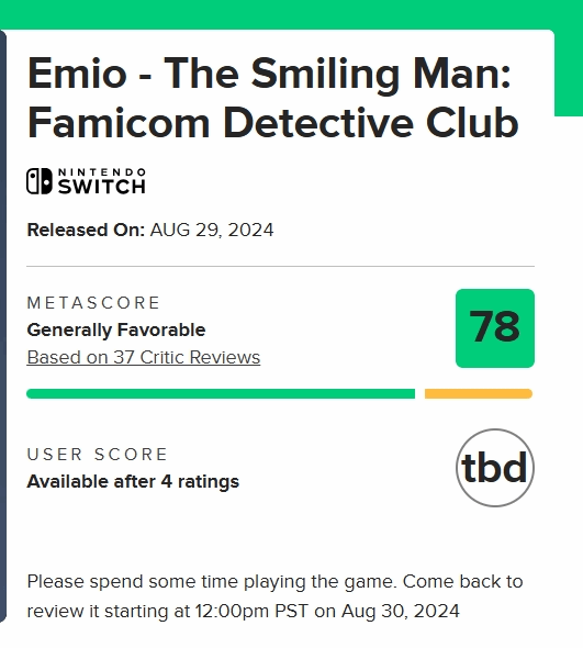 根据最新媒体评价,任天堂的文字冒险游戏《Famicom侦探俱乐部:笑脸男Emio》在37家知名媒体上获得了平均分为78分的好成绩。该游戏被广泛认可为一款精彩绝伦的游戏,拥有引人入胜的情节、惊艳的呈现效果以及许多令人毛骨悚然的时刻,给人留下深刻印象。