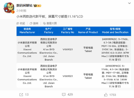 博主近日爆料称,小米即将推出两款新平板电脑,这两款新机均将配备11.16英寸的LCD显示屏。根据相关认证信息显示,2410CRP4CC和24091RPADC已通过无线电核准认证和3C认证,并支持45W和67W快充技术。