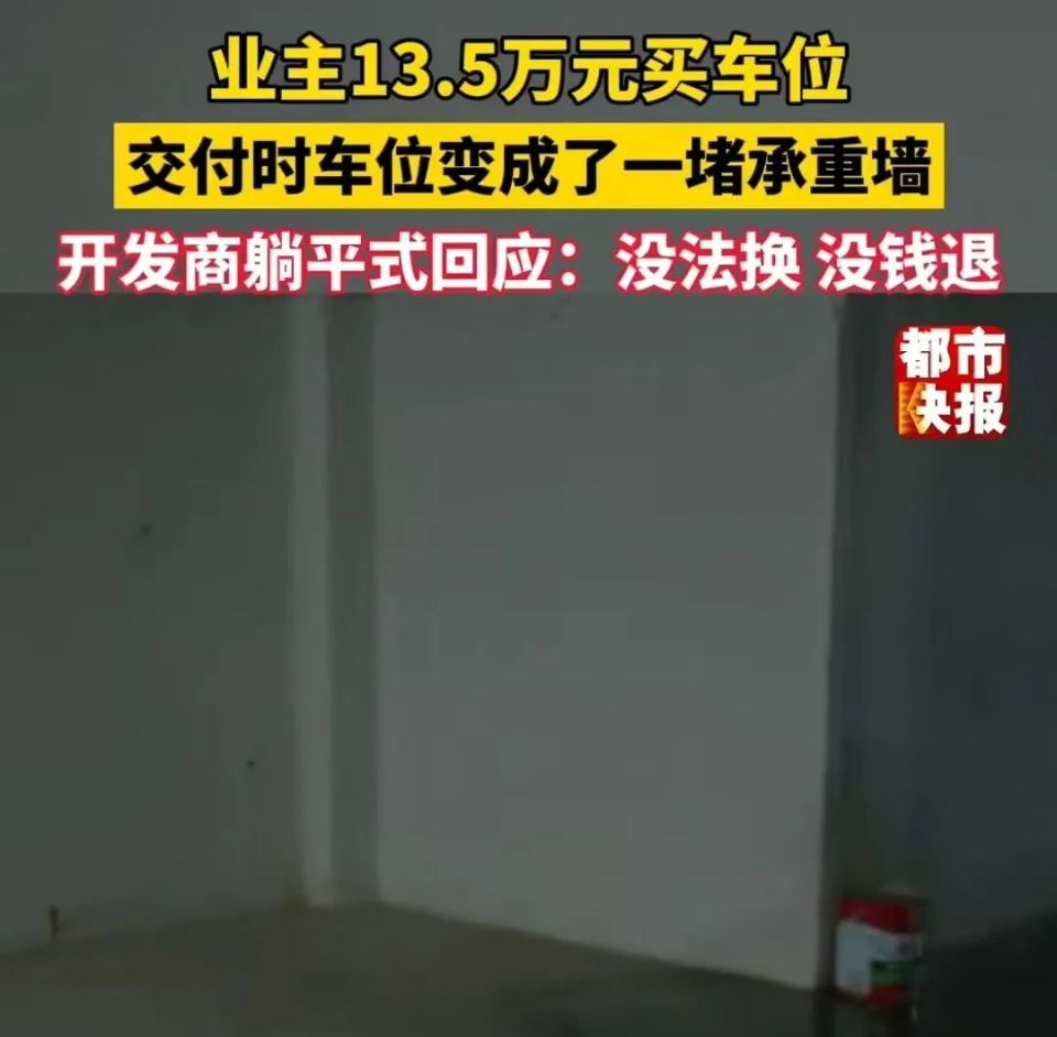 近日,陕西西安的白先生花13.5万买的车位,验收时发现变成了一面承重墙,想要按照合同约定要求退款时被告知无法退款,也无法更换车位。此事引发广泛关注。