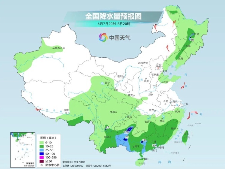 中央气象台预计,7日至10日,贵州、江南大部、华南等地将有中到大雨,其中,贵州中南部、广西、湖南南部、江西南部、福建西部、广东北部等地有暴雨或大暴雨,并将伴有短时强降水或雷暴大风等强对流天气。