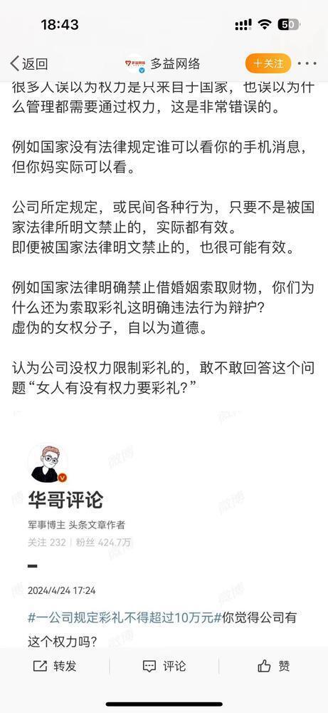 对于该规定引发的质疑,多益网络回应称,公司所定规定,或民间各种行为,只要不是被国家法律所明文禁止的,实际都有效。即便被国家法律明文禁止的,也很可能有效。例如国家法律明确禁止借婚姻索取财物,你们为什么还为索取彩礼这明确违法行为辩护?虚伪的女权分子,自以为道德。认为公司没权力限制彩礼的,敢不敢回答这个问题:“女人有没有权力要彩礼?”