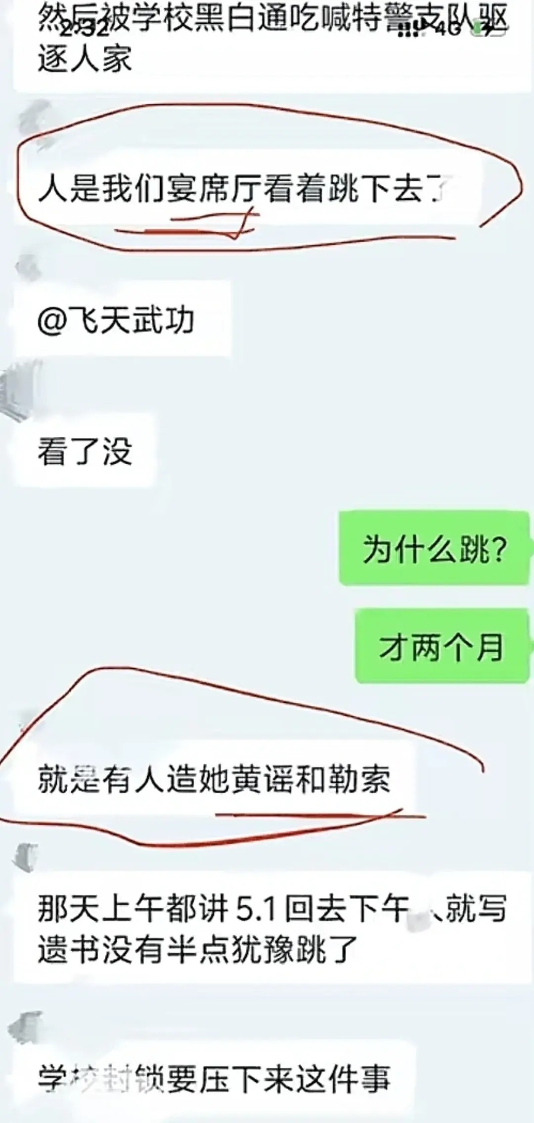 更让人难以置信的,该校学生群中,有人聊天称女生跳下来本来还有救的,硬是耽误20分钟,事发后,学生没收学生手机,拍摄的视频也被强制删除,直接死无对证。