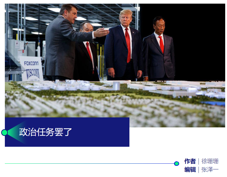 富士康想在美国建厂最早可以追溯到2016年,彼时郭台铭说要积极布局工业互联网,但面对急于证明自己政绩的特朗普,以及想要连任的威斯康星州长Scott Walker,富士康只好附和改口投资面板生产。