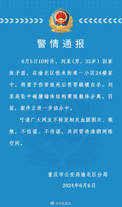 ?重庆市公安局渝北区分局6月6日通报,6月5日10时许,刘某(男,33岁)因家庭矛盾,在渝北区悦来街道一小区24楼家中,将妻子伤害致死后畏罪跳楼自杀。刘某高坠中碰撞墙体结构梁致躯体分离。目前,案件正进一步侦办中。