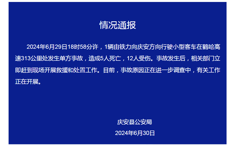 2024年6月29日18时58分许,1辆由铁力向庆安方向行驶小型客车在鹤哈高速313公里处发生单方事故,造成5人死亡,12人受伤。事故发生后,相关部门立即赶到现场开展救援和处置工作。目前,事故原因正在进一步调查中,有关工作正在开展。