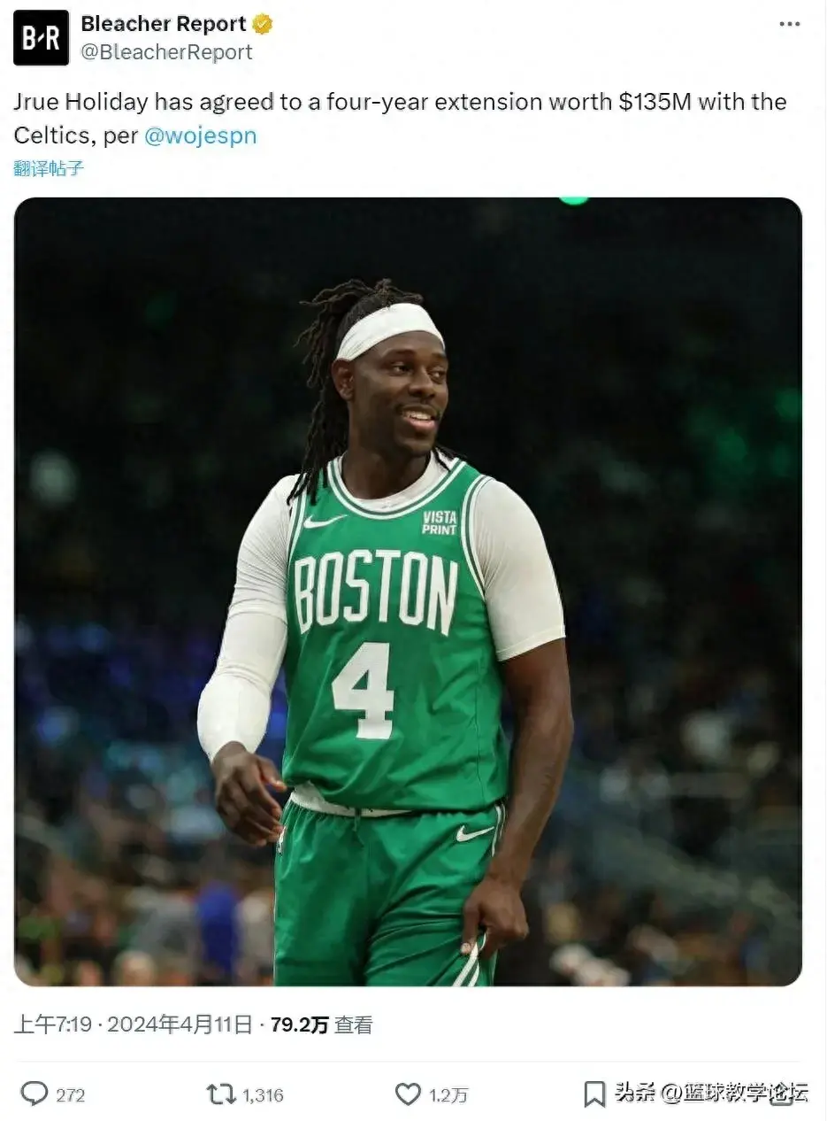 北京时间4月11日,据ESPN报道,朱-霍勒迪4年1.35亿美元提前续约凯尔特人!他现有的合同也是4年1.35亿美元,2024-25赛季是3736万美元的球员选项。这次提前续约之后,霍勒迪放弃球员选项,下赛季薪水降至3000万美元。