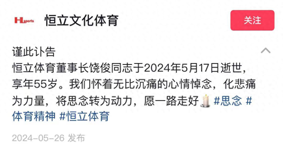 5月26日,恒力文化体育官方账号对外发布讣告,悲痛宣布恒力体育董事长饶俊于2024年5月17日逝世,享年55岁,这消息一出网友都难以置信,这么年轻怎么说走就走了呢?对于他的死因也是猜测连连。