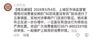 在博主发布的视频留言中,记者也注意到了此前上城区市场监管局的情况通报:2024年5月4日,上城区市场监督管理局对消费者反映的“叫花鸡里没有鸡”投诉进行了立案调查,实地对涉事商户门店进行取证,相关案件正在进一步办理中,一旦查实有违法行为将依法严肃处置。