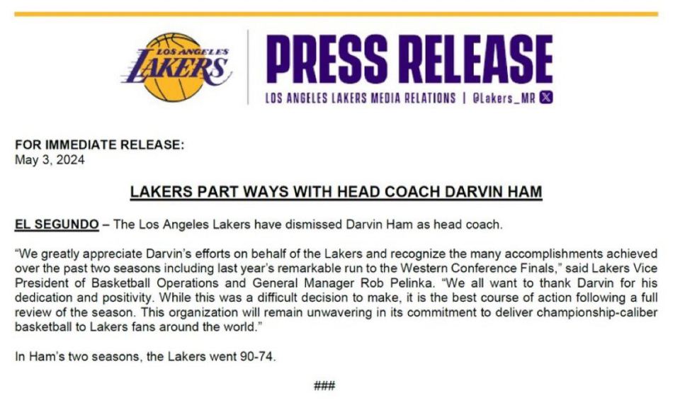 在湖人官方宣布与哈姆分道扬镳后,也公布了总经理佩林卡的一份声明。佩林卡在声明中表示:“我们非常感谢达文(哈姆)为湖人所做的努力,并认可他在过去两个赛季里取得的许多成就,包括上赛季打进西部决赛的出色表现。我们都要感谢他的奉献精神和积极性。虽然这是一个艰难的决定,但对整个赛季进行全面评估后,这是最好的选择。这支球队将坚定不移地致力于为全世界的湖人球迷继续带来冠军级别的篮球比赛。”