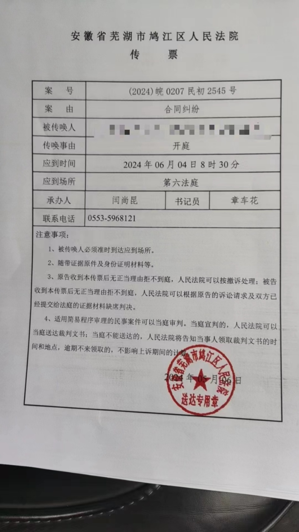 其中一张传票显示,李女士涉及一场合同纠纷,将于6月4日在安徽省芜湖市鸠江区人民法院开庭,“等于说,我一直被侵权。”