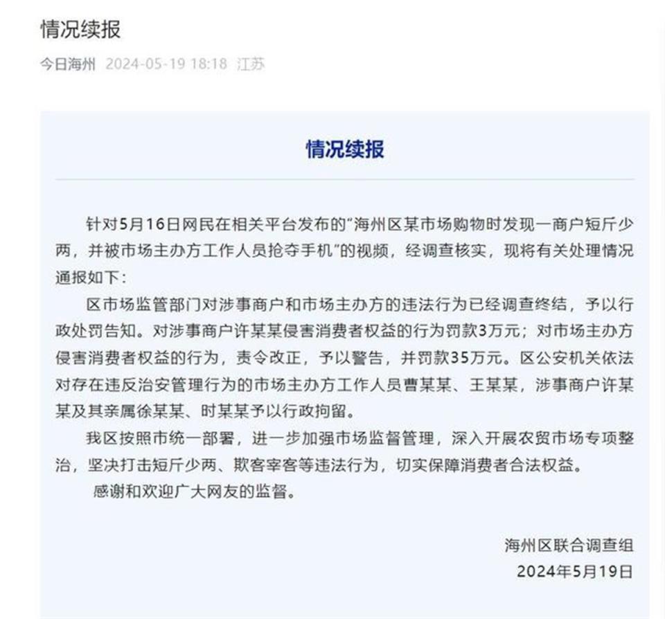 5月19日傍晚,连云港市海州区联合调查组发布情况续报:区市场监管部门对涉事商户和市场主办方的违法行为已经调查终结,予以行政处罚告知。对涉事商户许某某侵害消费者权益的行为罚款3万元;对市场主办方侵害消费者权益的行为,责令改正,予以警告,并罚款35万元。区公安机关依法对存在违反治安管理行为的市场主办方工作人员曹某某、王某某,涉事商户许某某及其亲属徐某某、时某某予以行政拘留。