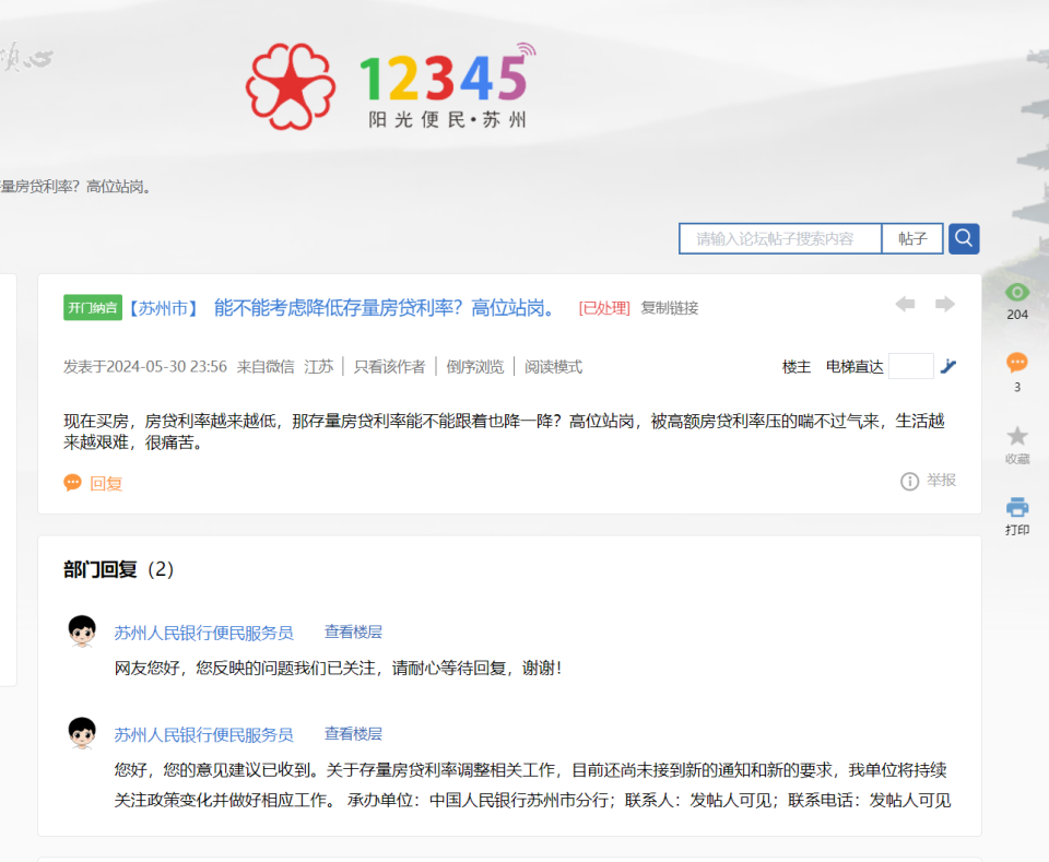 在政策发布的前几日,有苏州市民在苏州市12345阳光便民网站上反映降低房贷利率的问题。对此,人民银行苏州分行相关人士回复表示,关于存量房贷利率调整相关工作,目前还尚未接到新的通知和新的要求,将持续关注政策变化并做好相应工作。