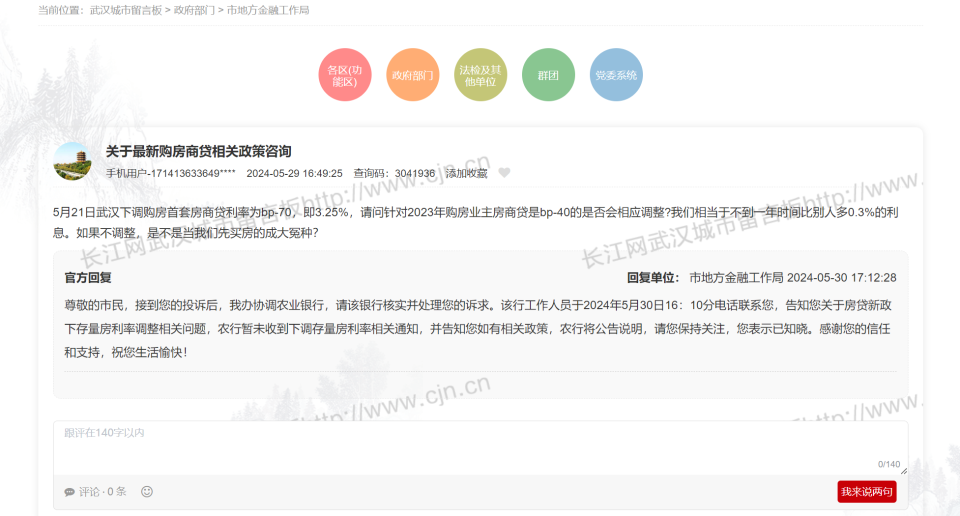 武汉是房贷新政后全国首个下调房贷利率下限的城市,也是首个落实下调首套房和二套房首付比例的城市。近期,有多位武汉市民在武汉城市留言板反映,是否考虑降低存量房利率,希望下调利率减轻供房负担。