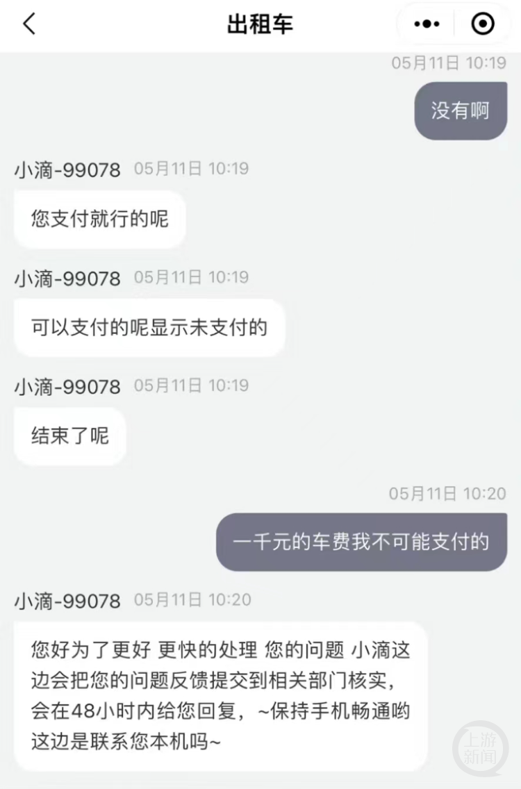 “我以为是司机当时没有结束行程才导致账单这么多的。”小关迅速联系了滴滴出行在线客服。客服查询后证实,行程订单在2017年10月22日下午3点10分结束,但表示“这是一口价,是正常的,订单就是1414元呢,显示未支付,可以支付的。”小关表示不可能支付这笔费用,而且客服回答也让小关感到不满。客服表示,会向相关部门反馈,并在48小时内回复。