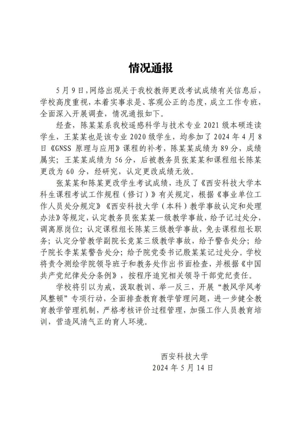 转载:https://new.qq.com/rain/a/20240514A05LD400 2024-05-14 15:11·新京报·发布于北京 新京报讯 5月14日,西安科技大学发布情况通报。通报内容如下:编辑 李忆林子此前报道西安科技大学学生成绩按“闹”修改?责任人:改成绩是为“救”学生