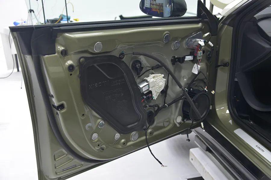 拆掉车门内饰板,前门内部大部分由钢板覆盖,贴有发泡棉密封。