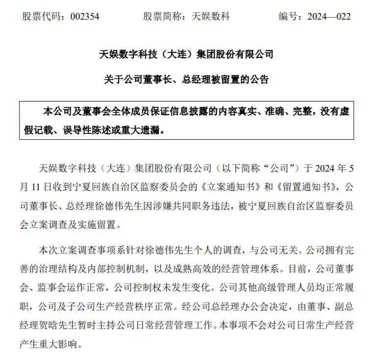 天娱数科5月12日发布公告称,于2024年5月11日收到宁夏回族自治区监察委员会的《立案通知书》和《留置通知书》,公司董事长、总经理徐德伟先生因涉嫌共同职务违法,被宁夏回族自治区监察委员会立案调查及实施留置。