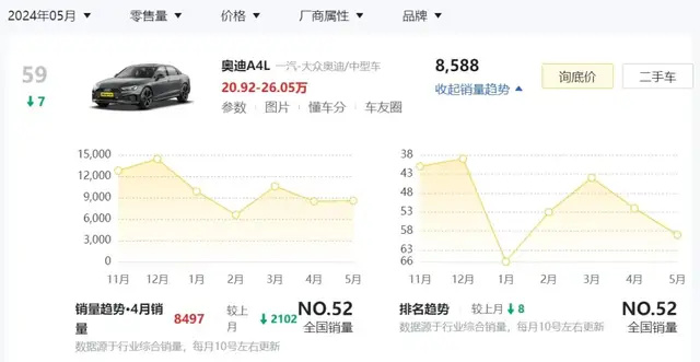 到2023年,奥迪A4L还能每月卖出16000+台,但今年3月销量只有10599台,4月又降到了8497台,5月也仅恢复到了8588辆。