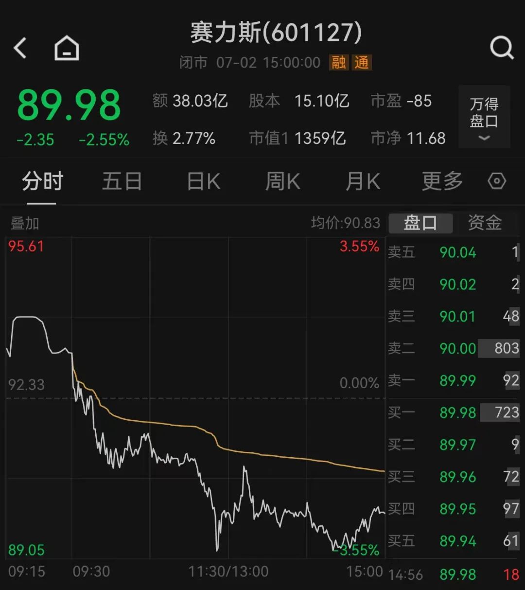 截至7月2日收盘,赛力斯报89.98元/股,总市值1359亿元。