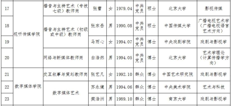 据北京电影学院人事处官网消息:根据《北京电影学院公开招聘工作实施办法》,经招聘各环节考核及校长办公会审议通过,现将2024年公开招聘拟聘人员予以公示。最终录用结果,视体检、政审、非京生源指标等情况综合确认。极目新闻记者注意到,一位名叫张蕾的女士拟被聘为该校播音与主持艺术教师岗。6月21日,记者致电校方核实此人是否前央视女主持人,工作人员表示不方便透露个人信息。