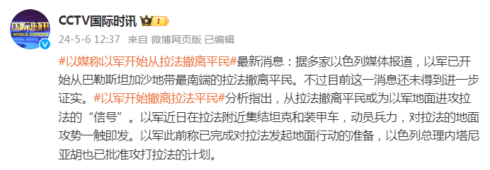 最新消息:据多家以色列媒体报道,以军已开始从巴勒斯坦加沙地带最南端的拉法撤离平民。不过目前这一消息还未得到进一步证实。分析指出,从拉法撤离平民或为以军地面进攻拉法的“信号”。以军近日在拉法附近集结坦克和装甲车,动员兵力,对拉法的地面攻势一触即发。以军此前称已完成对拉法发起地面行动的准备,以色列总理内塔尼亚胡也已批准攻打拉法的计划。?