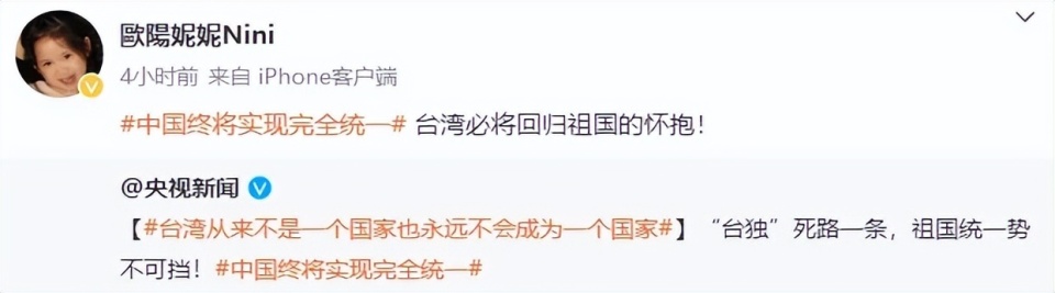 引起较大反响的两位分别是欧阳娜娜和侯佩岑。欧阳娜娜曾在海内外社交平台同步表态过。而今也是第一个转发“台湾回归祖国”的台湾省艺人。