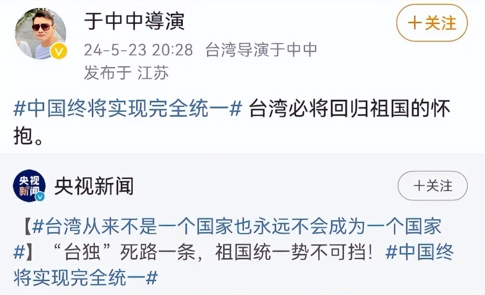 台湾省导演于中中与翟友宁也都转发表态了,其中翟友宁曾因《亲爱的热爱的》引发立场争议话题,一直饱受诟病。此次,翟友宁转发“台湾回归祖国怀抱”彻底澄清立场。