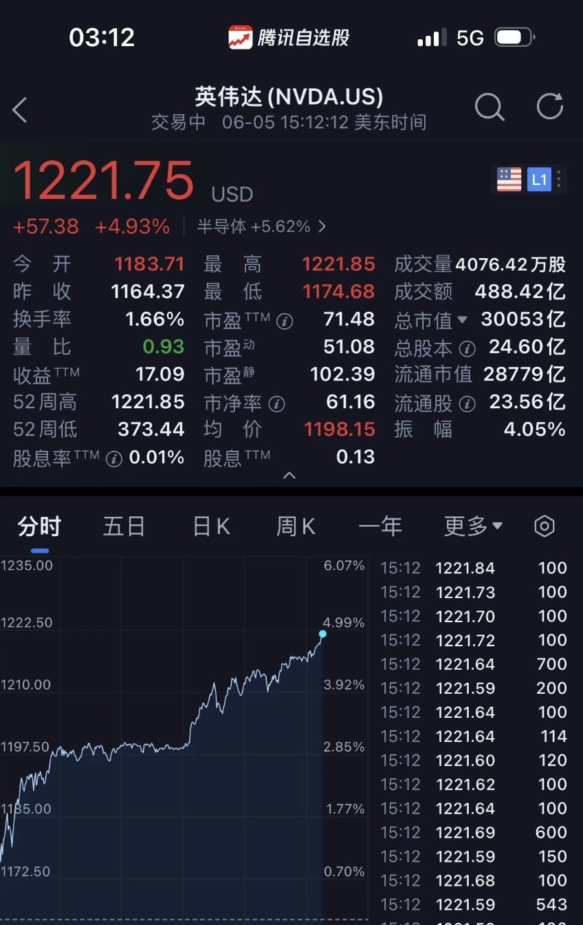 凌晨3点12分,英伟达股价一度飙升至1222.99美元,市值突破3.0053万亿美元,历史上首次超越苹果。
