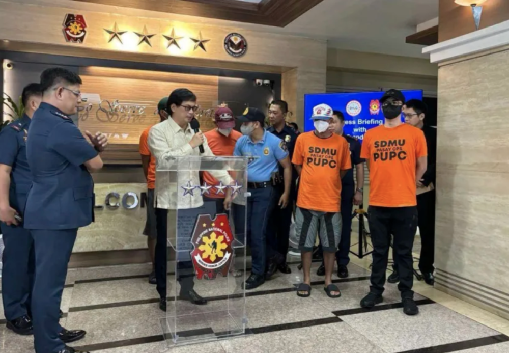 ▲菲律宾内政部长阿巴洛斯(中)宣布,有4名警察因绑架4名外国游客并索要赎金而被捕。图中穿橙色衣服的系犯罪嫌疑人