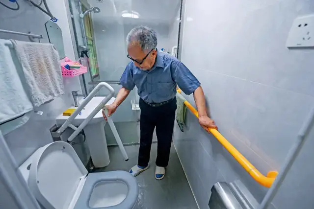 2023年6月15日,浙江嘉兴市秀洲区新塍镇,蓬莱社区的83岁独居老人孙志龙展示经过适老化改造后加了扶手的卫生间。图/新华