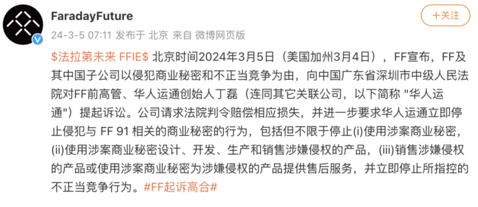 3月5日,法拉第未来(FF)公告称,FF及其中国子公司以侵犯商业秘密和不正当竞争为由,向中国广东省深圳市中级人民法院对FF前高管、华人运通创始人丁磊(连同其它关联公司,以下简称“华人运通”)提起诉讼。公司请求法院判令赔偿相应损失,并进一步要求华人运通立即停止侵犯与FF91相关的商业秘密的行为,包括但不限于停止使用涉案商业秘密,使用涉案商业秘密设计、开发、生产和销售涉嫌侵权的产品,销售涉嫌侵权的产品或使用涉案商业秘密为涉嫌侵权的产品提供售后服务,并立即停止所指控的不正当竞争行为。
