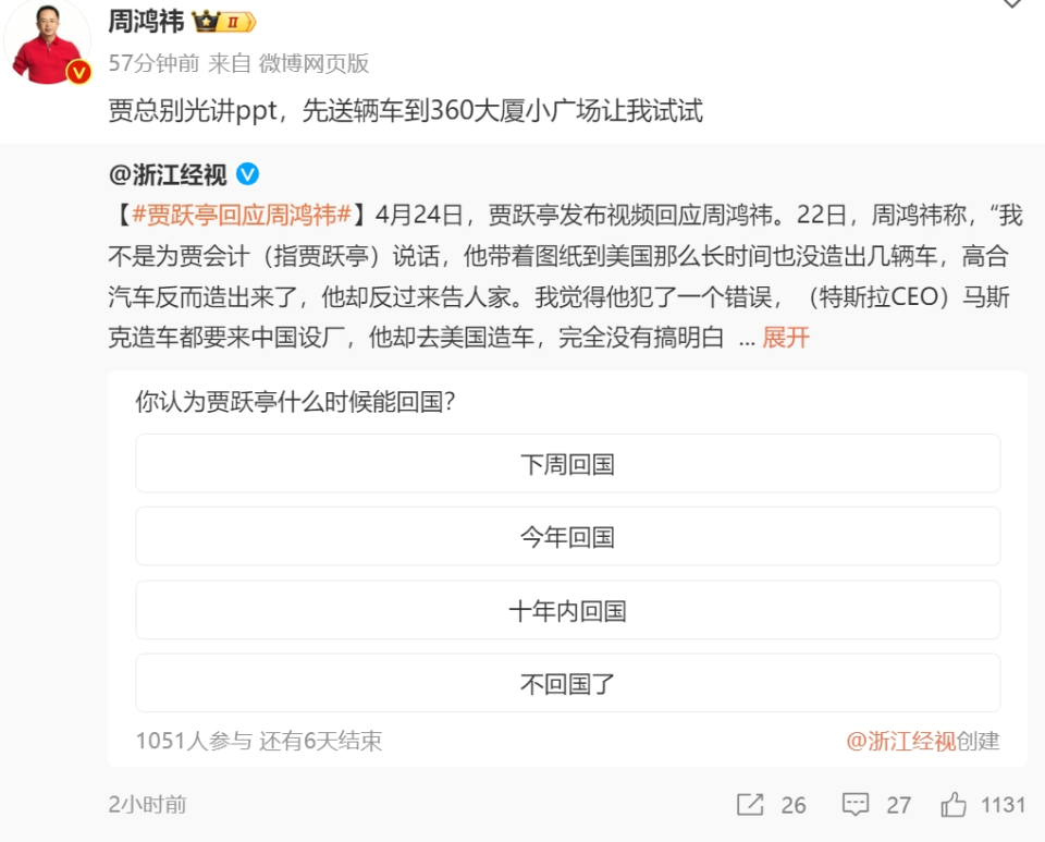 随后,周鸿祎在微博发文回应称,“贾总别光讲ppt,先送辆车到360大厦小广场让我试试。”