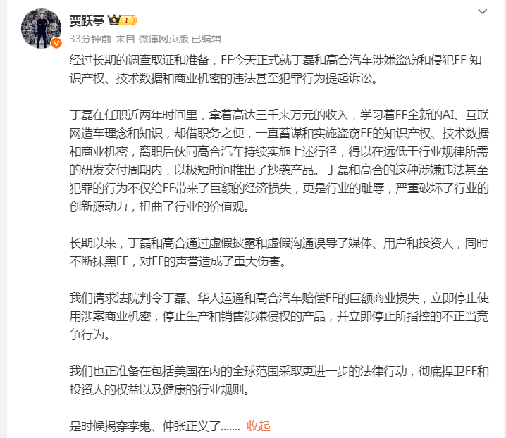 贾跃亭也“亲自下场”发文炮轰丁磊和高合是行业的耻辱,并表示经过长期的调查取证和准备,FF今天正式就丁磊和高合汽车涉嫌盗窃和侵犯FF知识产权、技术数据和商业机密的违法甚至犯罪行为提起诉讼。??
