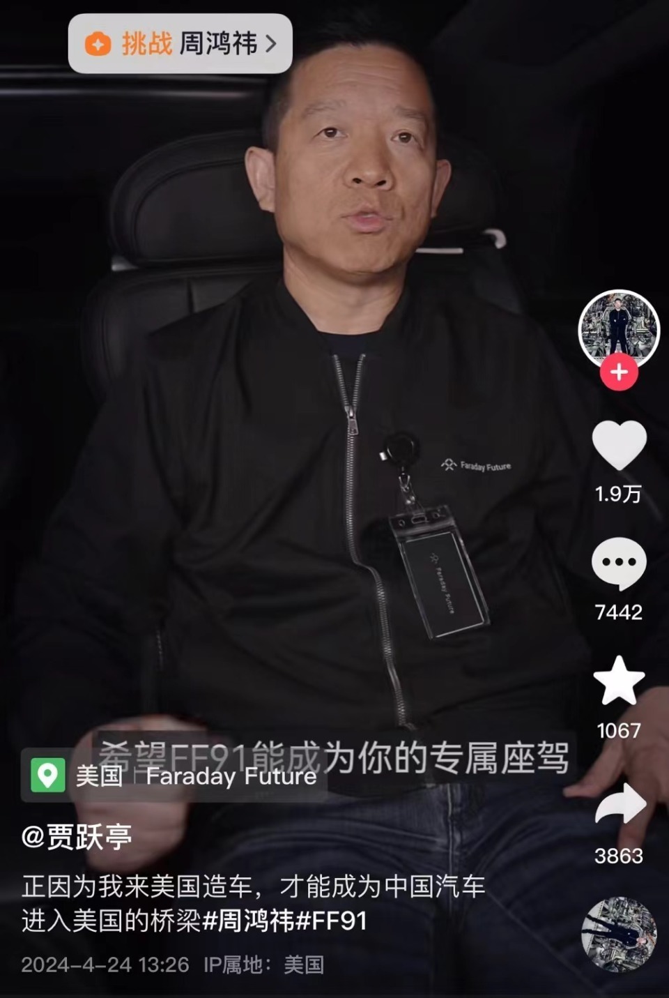 4月24日,贾跃亭发布视频对此进行回应,“老周(周鸿祎)你好,我现在正坐在FF91的后排,而这台车也正是从后排开始定义的,我们的零重力座椅和智能后排互联网系统,无论是工作还是生活都绝对是你最需要的。下次你在美国的时候,希望FF91能成为你的专属座驾。