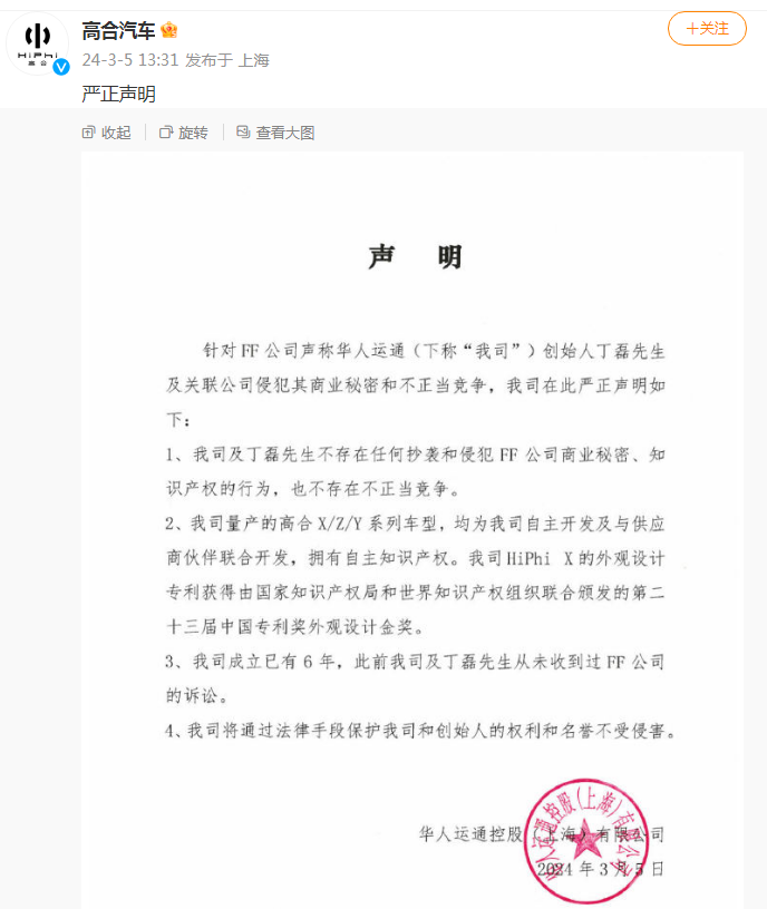3月5日,高合汽车发布声明称,该公司及丁磊不存在任何抄袭和侵犯FF 公司商业秘密、知识产权的行为,也不存在不正当竞争;该公司量产的高合X/Z/Y系列车型,均为自主开发及与供应商伙伴联合开发,拥有自主知识产权;公司成立已有6年,此前公司及丁磊从未收到过F公司的诉讼。