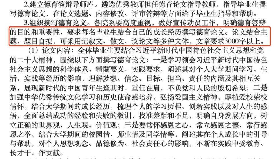 上述《通知》中提到,河北大学2024届本科毕业生德育答辩的主题为“涵养家国情怀 书写青春华章”,要求每名毕业生结合自己的成长经历撰写德育论文,可采用记叙文、散文、议论文等多种文体,要求3000字以上。
