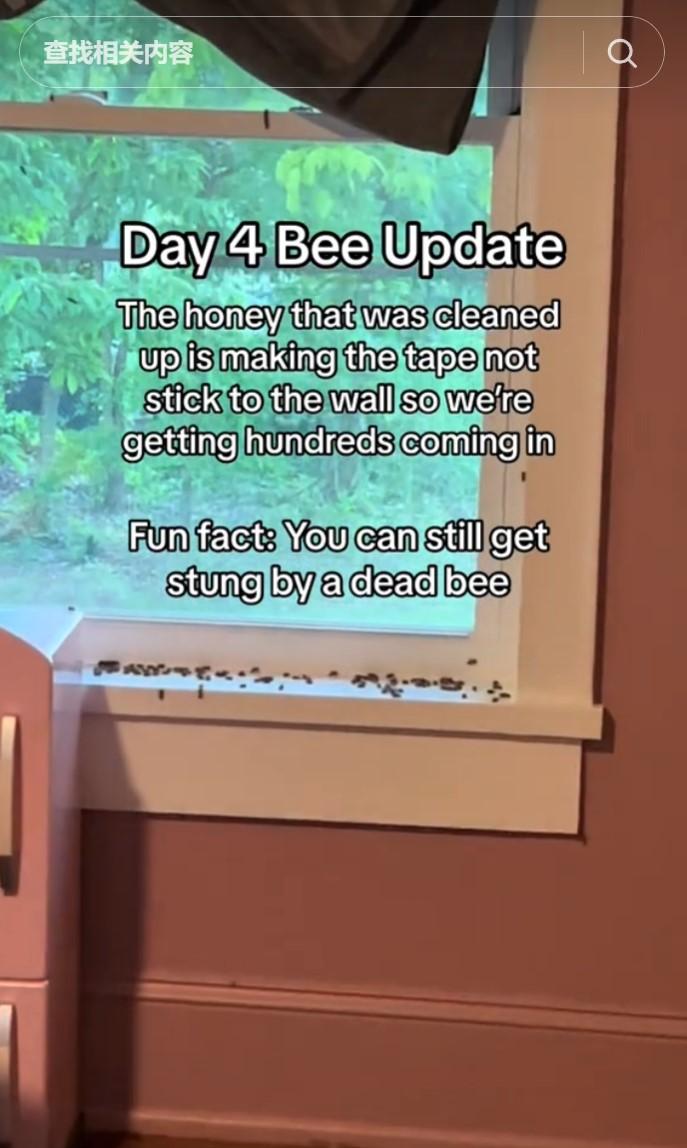 蜜蜂即便死亡,蜂刺仍然可能蜇伤人,它们遍布地板和窗台的尸体就像一颗颗“地雷”,Ashley二人不得不整天穿着橡胶靴,拿东西也都是跑进跑出,以免被蛰到。