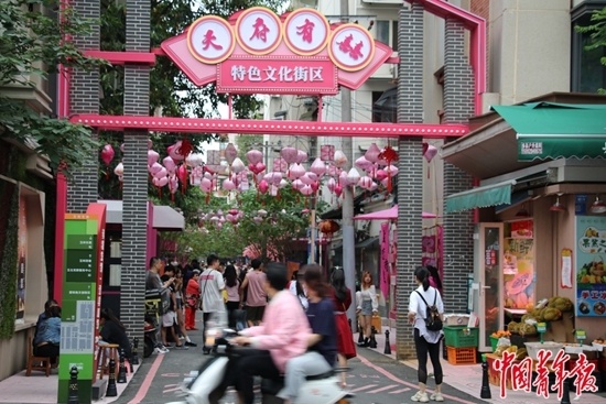 ????5月1日,玉林北路社区的婚恋主题文化街区亮相,亮眼的粉色为街道增添了浪漫气息:120米长的街道被粉刷一新,路面有粉色的爱情宣言,路边有粉色的互动装置,头顶还有错落有致的粉色灯笼……