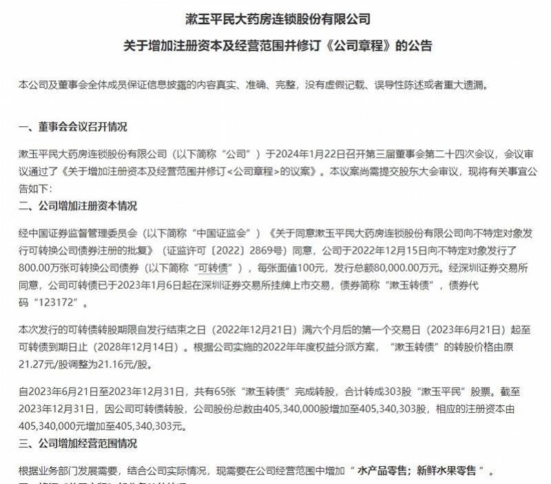 无独有偶,山东知名药店龙头企业漱玉平民(301017.SZ)也曾就此披露公告称,将增加经营范围。公告显示,根据业务部门发展需要,结合公司实际情况,现需要在公司经营范围中增加“ 水产品零售;新鲜水果零售 ”。