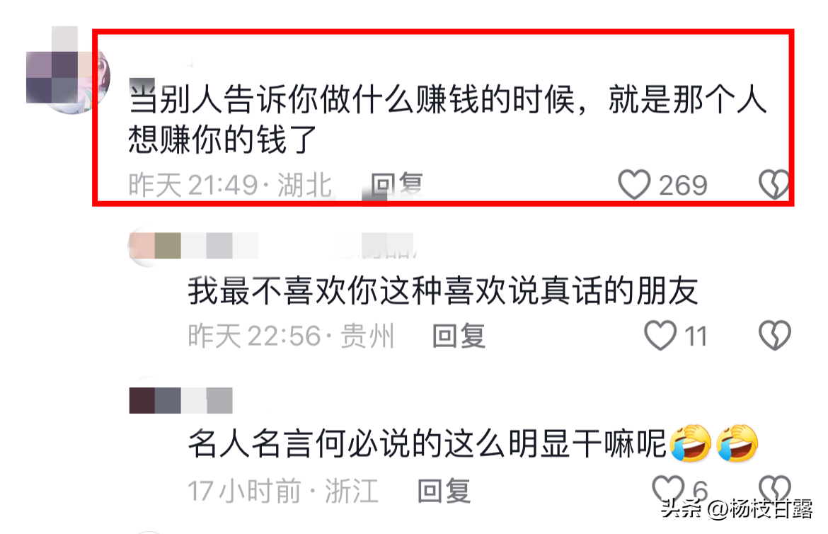 “这句话一针见血地揭露了某些人的真实意图,提醒我们要有警惕心,不要被眼前的利益所迷惑,堪称一针见血的社会观察。”