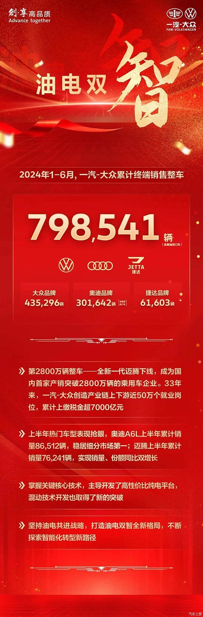 一汽-大众上半年终端整车销售数据公布,共售出798541台新车。其中,大众品牌销量为435296台,奥迪品牌销量为301642台(含进口车),捷达品牌销量为61603台。
