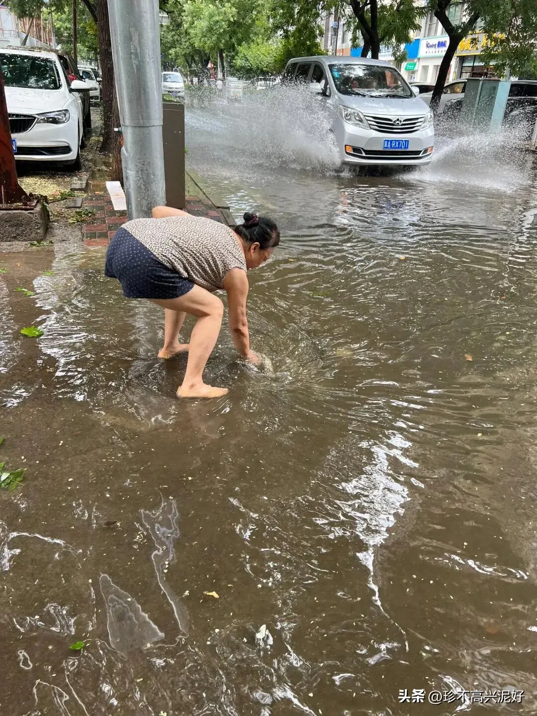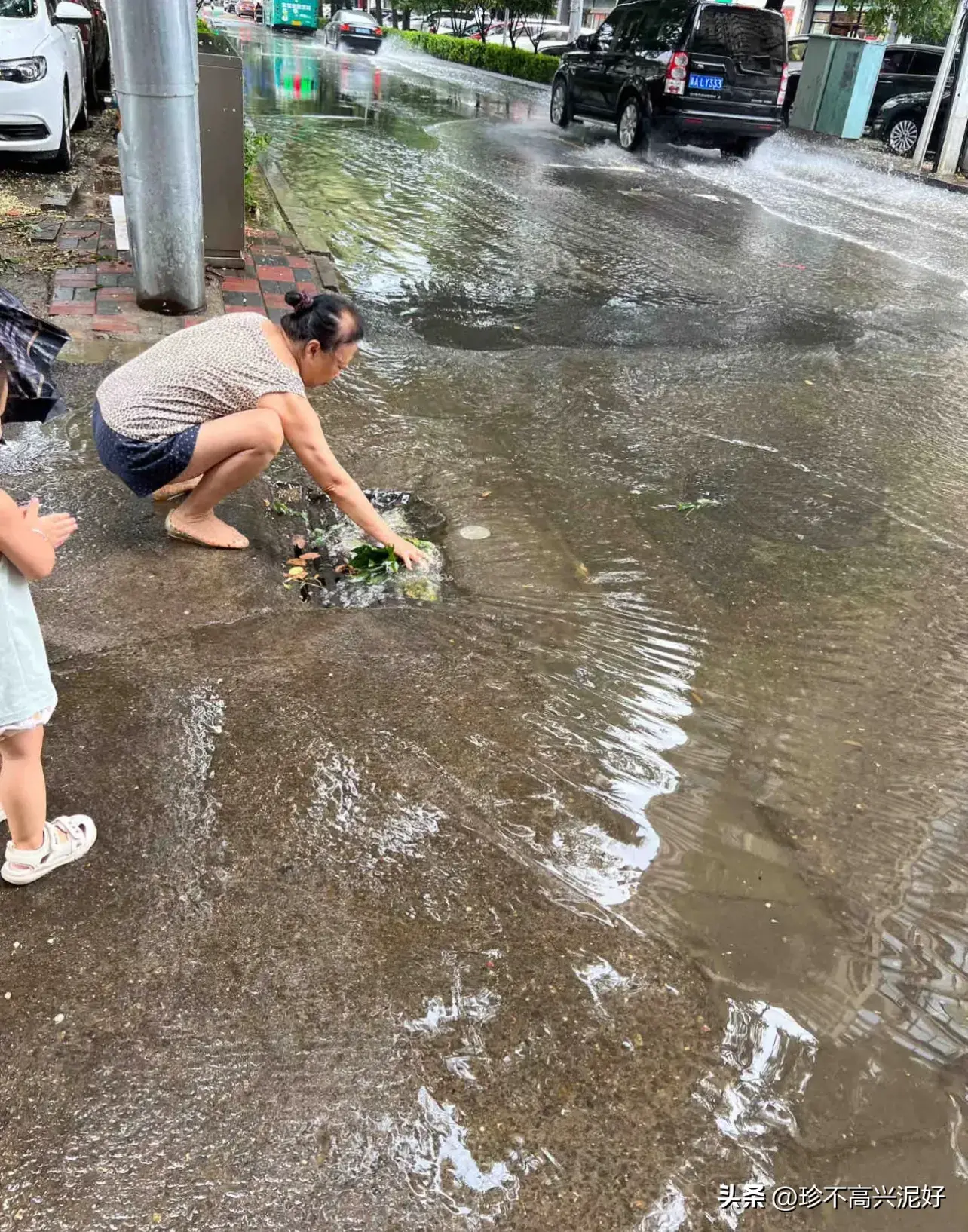 好心人阿姨还在不停的堵住流水口的树叶。为阿姨点赞。