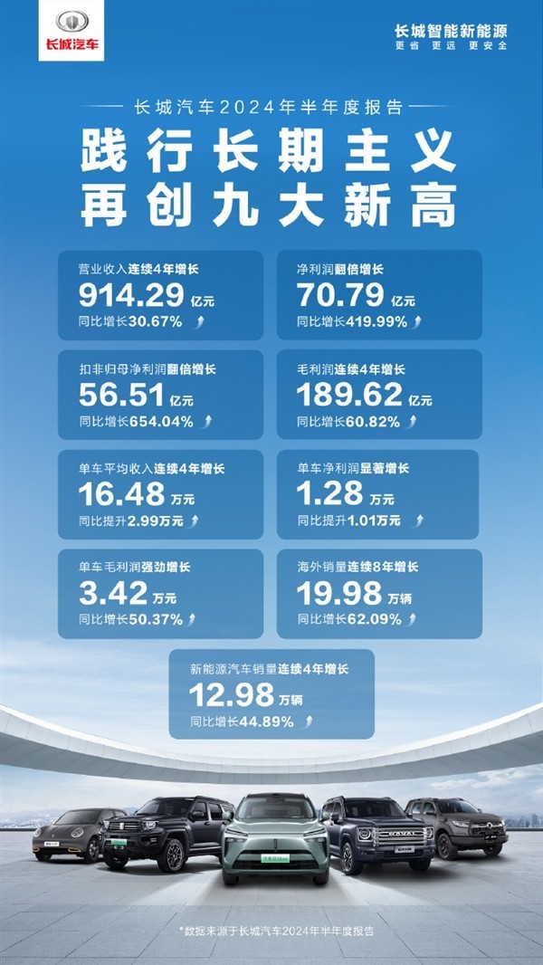 长城汽车于2024年发布了其2024年上半年度的财务报告。报告显示,该公司实现了连续第四年的增长,其营收达到了914.29亿元人民币。更令人瞩目的是,其净利润同比增长了惊人的419.99%,达到70.79亿元人民币。