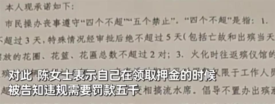 翁垟街道下辖村的村干部康明(化名)告诉极目新闻记者,陈女士所说的押金是指当地有人去世后,家属要先向街道相关部门缴纳1万元的丧事简办保证金,如能做到在72小时内出殡、摆酒不超过5桌等规定,这1万元最后还会退还给家属,否则就要进行扣款处罚。