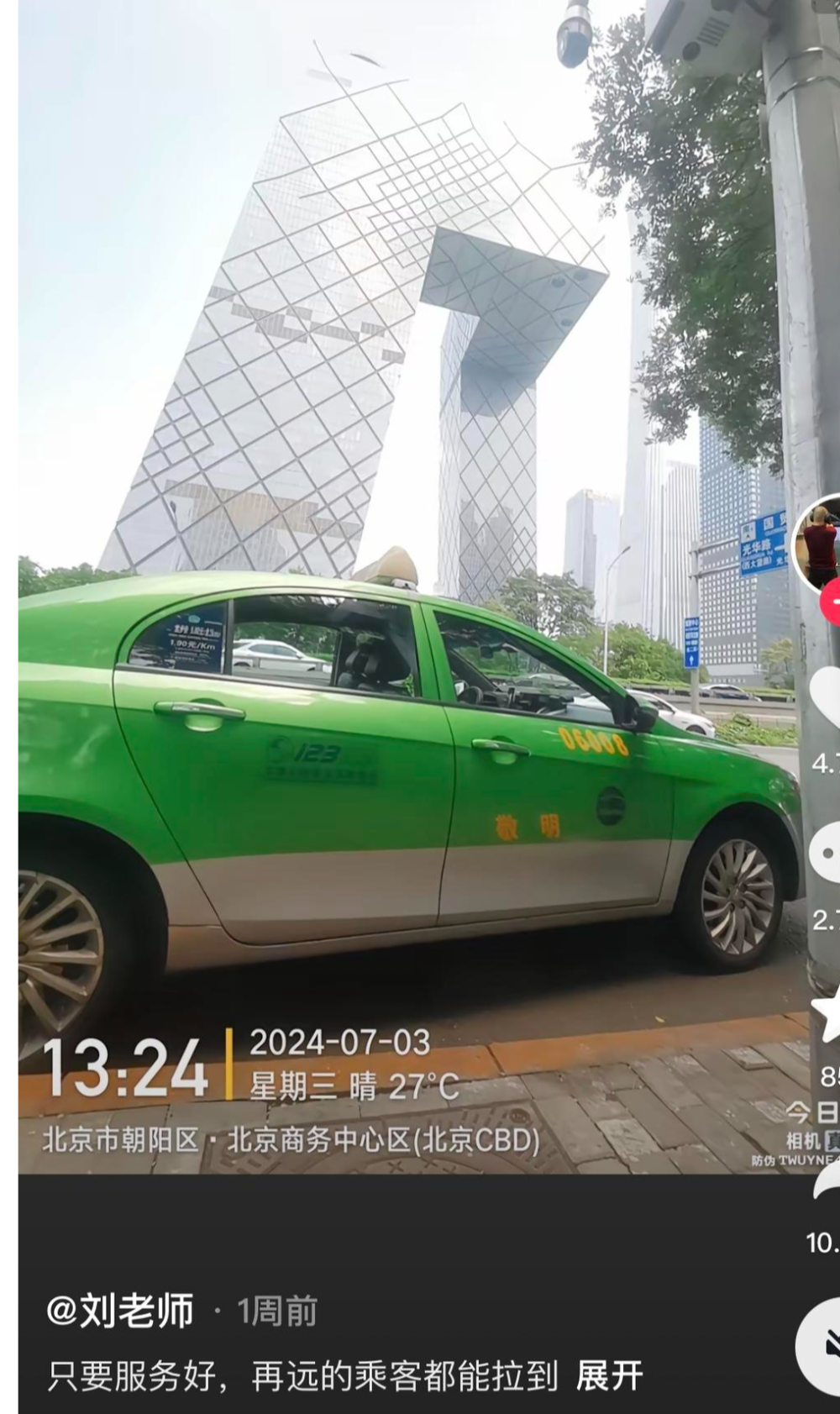 这几天,几张照片火了!照片中,牌照为川A的绿色出租车竟出现在北京的央视大楼前。发布图片的网友配文:“只要服务好,再远的乘客都能拉到。”原来,这是一位成都出租车师傅拉了乘客去北京。网友评论:“上一个是重庆‘法拉利’到上海,现在又是成都到北京,川渝果然不是一般的兄弟伙。”