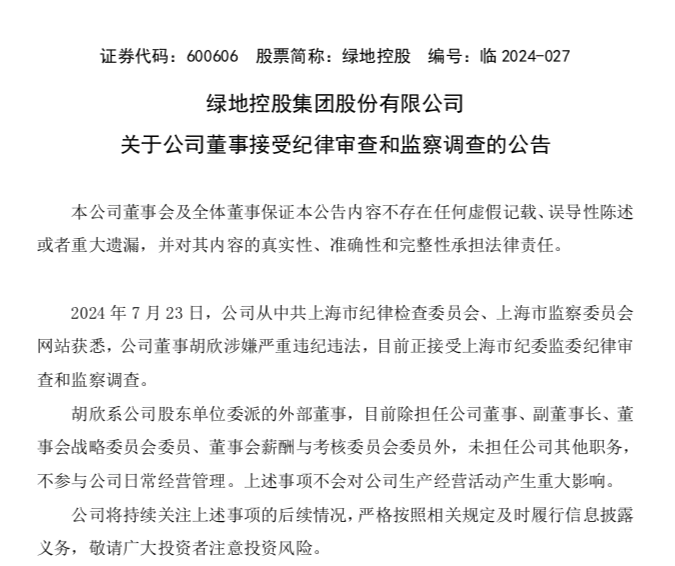 7月23日晚间,绿地控股(600606)公告称,公司董事胡欣涉嫌严重违纪违法,目前正接受上海市纪委监委纪律审查和监察调查。