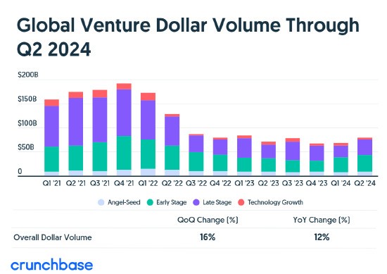 Crunchbase数据还显示,尽管第二季度融资额有所增加,但今年上半年的融资额出现了下滑。上半年,全球初创公司融资额为1470亿美元,同比下滑5%,低于2023年上半年的1540亿美元,但与2023年下半年持平。